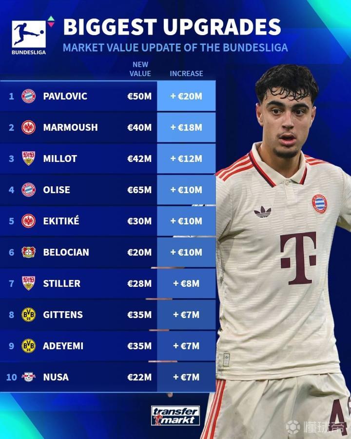 拜仁慕尼黑的新援奥利塞在本赛季已经有6球3次助攻入账,这名法国前锋的身价上涨了1000万欧元。同时,多特蒙德队的边锋吉滕斯和阿德耶米,他们的身价也都上涨了700万欧元。德甲联赛中的球员身价变动巨大,市场需求和表现直接影响着他们的身价。